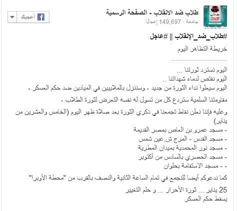 وقالت الحركة في بيان لها عبر صفحتها الرسمية على موقع التواصل الاجتماعي – فيس بوك – "اليوم نسترد ثورتنا ،اليوم نقتص لدماء شهدائنا ،اليوم سيعلوا نداء الثورة من جديد ، وسننزل بالملايين في الميادين ضد حكم العسكر" مقاومتنا السلمية ستردع كل من تسول له نفسه التعرض لثورة الطلاب "