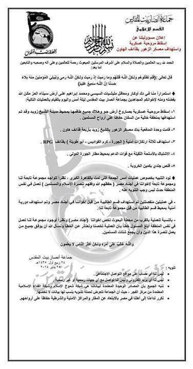 تبنت جماعة أنصار بيت المقدس في بيان لها مسؤوليتها عن استهداف المروحية العسكرية غرب الشيخ زويد بشمال سيناء والذي راح ضحيتها طاقمها المكون من ثلاث ضباط ومهندس حربي ومساعده.