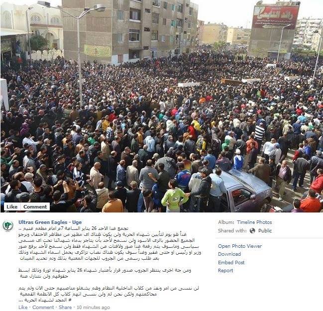 و طالب الاولتراس في بيان له علي موقع التواصل الإجتماعي "فيس بوك" بالتجمع غداً أمام مطعم غنيم بدائرة حي الشرق و طالب ايضاً بعدم المتاجرة بدماء " شهدائنا " تحت أي مسمي سياسي و لأن يسمح الايجيلز برفع صور "وزير أو رئيس أو حتي غفير".