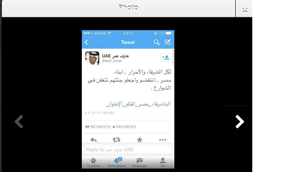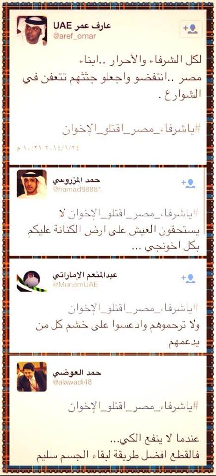 الشاعر والإعلامي الاماراتي عارف عمر بدوره كتب قائلا : " يا أبناء مصر انتفضوا واجعلوا جثثهم تتعفن في الشوارع"،أما الكاتب الإماراتي ماجد الرئيسي فقال" لايستحقون طعام وشراب السجون وجزاء الاخوان هو التخلص منهم ودفنهم أحياء"،وقال الشاعر الاماراتي سعد الكتيبي اذا لم يقف شرفاء مصر الآن أمام الاخوان وارهابهم فلن يكون هناك أمان أبدا.