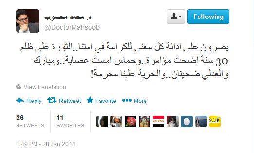 وأضاف محسوب فى تغريدة عبر صفحته الشخصية على موقع التواصل الإجتماعي "تويتر" : الثورة على ظلم 30 سنة أضحت مؤامرة . وحماس أمست عصابة..ومبارك والعدلي ضحيتان..والحرية علينا محرمة".