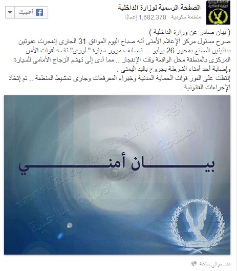 صرح مسئول مركز الإعلام الأمنى أنه – صباح اليوم الجمعة – انفجرت عبوتين بدائيتين الصنع بمحور 26 يوليو، والذي صادف مرور سيارة " لوري" تابعه لقوات أمن الانقلاب بالمنطقة محل الواقعة وقت الانفجار، مما أدى إلى تهشم الزجاج الأمامى للسيارة وإصابة أحد أمناء الشرطة بجروح باليد اليمنى .