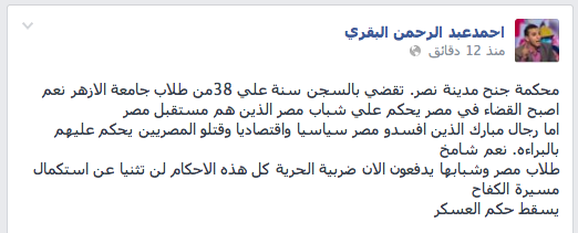 وقال البقري عبر حسابه الشخصي على موقع التواصل الاجتماعي "فيس بوك" : "إن طلاب مصر وشبابها يدفعون الآن ضريبة الحرية"، مؤكدا أن كل هذه الأحكام لن تثنيهم عن استكمال مسيرة الكفاح.
