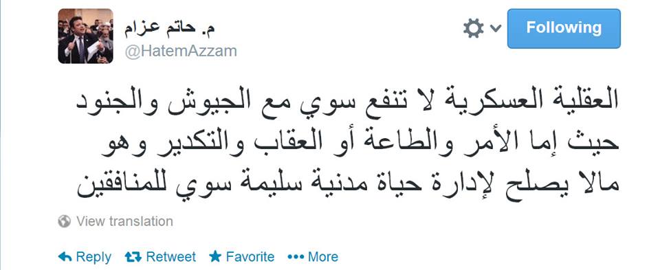 وذكر عزام عبر صفحته علي موقع التواصل الإجتماعي "تويتر" : " أن حكم العسكر لا يصلح لإدارة حياة مدنية سليمة سوى للمنافقين".
