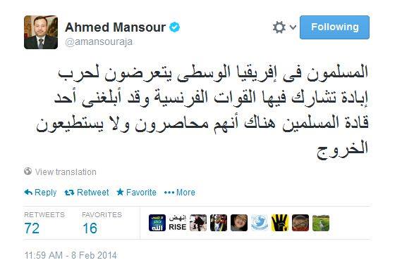 قال الإعلامي أحمد منصور إن المسلمون فى دولة إفريقيا الوسطى يتعرضون لحرب إبادة تشارك فيها القوات الفرنسية.