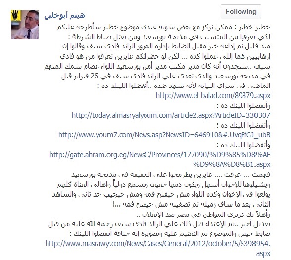 وقال ابو خليل في تدوينته:"مكن نركز مع بعض شوية عندي موضوع خطير سأطرحه عليكم لكي تعرفوا من المتسبب في مذبحة بورسعيد ومن يقتل ضباط الشرطة : منذ قليل تم إذاعة خبر مقتل الضابط بإدارة المرور الرائد فادي سيف وقالوا إن إرهابيين هما إللي عملوا كده".