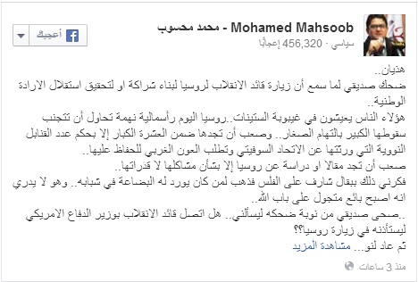 وأضاف "محسوب" عبر صفحته الرسمية على موقع التواصل الاجتمعي – فيسبوك -: "روسيا اليوم رأسمالية نهمة تحاول أن تتجنب سقوطها الكبير بالتهام الصغار، وصعب أن تجدها ضمن العشرة الكبار إلا بحكم عدد القنابل النووية التي ورثتها عن الاتحاد السوفيتي، وتطلب العون الغربي للحفاظ عليها".