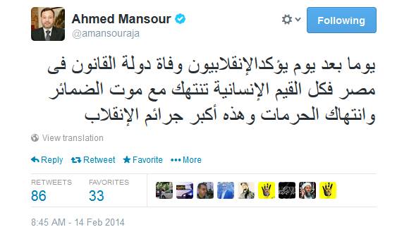 قال الإعلامي أحمد منصور إن الانقلابيين يؤكدون يوما بعد يوم وفاة دولة القانون فى مصر.