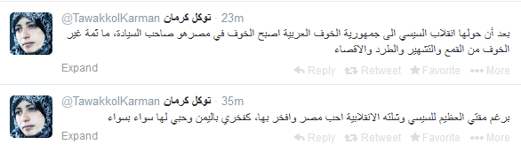 قالت الناشطة توكل كرمان الحائزة على جائزة نوبل للسلام ، أن السيسى حول جمهورية مصر العربية إلى جمهورية الخوف العربية.