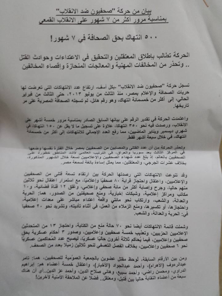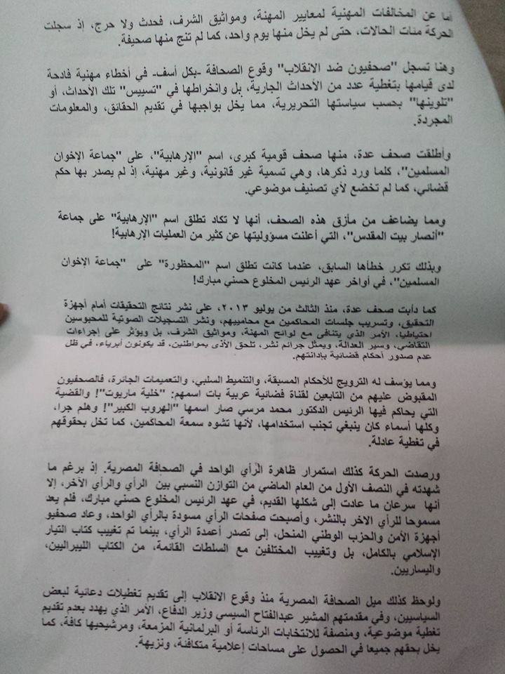 واستعرضت الحركة موقف مجلس نقابة الصحفيين السلبي من قمع سلطات الانقلاب لحريات الرأي والتعبير، وتلفيق القضايا للصحفيين والإعلاميين، وكذلك موقفه السلبي إزاء قضايا أعضاء النقابة من ( الشهداء ، والجرحى، والمعتقلين، والموقوفين من العمل).