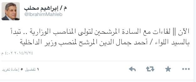 كما أشار محلب إلى أنه قد بدأ فى لقاء الساده المرشحين لتولي الحقائب الوزاريه فى حكومته , وقد بدأ باللواء أحمد جمال الدين المرشح لمنصب وزير الداخلية فى الحكومة الجديدة .