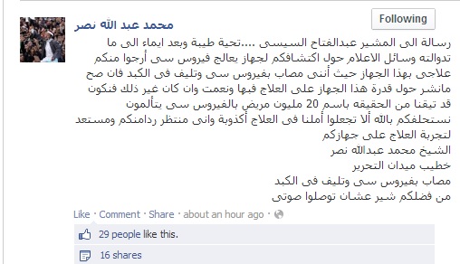 وقال على حسابه الرسمي:"رسالة إلى المشير عبد الفتاح السيسى تحية طيبة وبعد إيماء إلى ما تدوالته وسائل الإعلام حول اكتشافكم لجهاز يعالج فيروس سى أرجوا منكم علاجى بهذا الجهاز حيث أننى مصاب بفيروس سى وتليف فى الكبد ".
