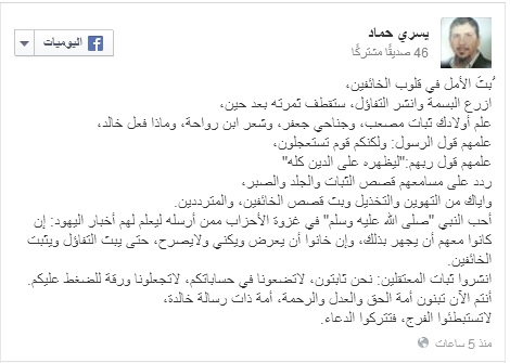 وقال – عبر حسابه الشخصى- : ُبثَ الأمل في قلوب الخائفين، ازرع البسمة وانشر التفاؤل، ستقطف ثمرته بعد حين، علم أولادك ثبات مصعب، وجناحي جعفر، وشعر ابن رواحة، وماذا فعل خالد، علمهم قول الرسول: ولكنكم قوم تستعجلون، علمهم قول ربهم:"ليظهره على الدين كله" ردد على مسامعهم قصص الثبات والجلد والصبر، واياك من التهوين والتخذيل وبث قصص الخائفين، والمترددين.