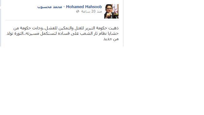 محسوب : حكومة محلب جاءت من نظام ثار عليه الشعب