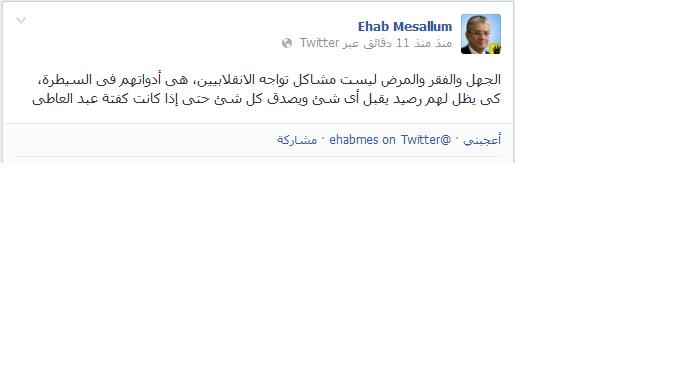 وقال – عبر حسابه الرسمي على موقع التواصل الاجتماعي فيس بوك -: إن " الجهل، والفقر، والمرض ليست مشاكل تواجه الانقلابيين، هي أدواتهم في السيطرة؛ كي يظل لهم رصيد يقبل أي شيئ، ويصدق كل شيئ حتى إذا كانت كفتة عبد العاطي".