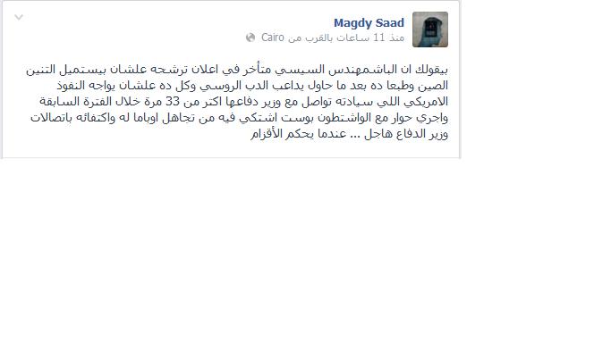 وقال – عبر حسابه الرسمي على موقع التواصل الاجتماعي فيس بوك – : "بيقولك إن الباشمهندس السيسي متأخر في إعلان ترشحه علشان بيستميل التنين الصين، وطبعا ده بعد ما حاول يداعب الدب الروسي، وكل ده علشان يواجه النفوذ الأمريكي اللي سيادته تواصل مع وزير دفاعها أكتر من 33 مرة خلال الفترة السابقة، وأجرى حوارا مع الواشتطون بوست اشتكي فيه من تجاهل أوباما له، واكتفائه باتصالات وزير الدفاع هاجل … عندما يحكم الأقزام"