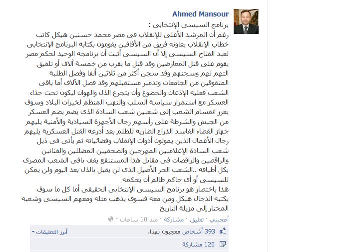 قال الإعلامي أحمد منصور أن البرنامج الانتخابي للمشير عبد الفتاح السيسى قائد الانقلاب يقوم على قتل المعارضين أو تلفيق التهم لهم وسجنهم وفصل الطلبة المتفوقين من الجامعات وعلى باقى الشعب الإذعان والخضوع تحت حذاء العسكر.