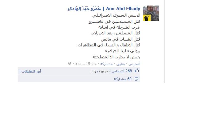 وقال عبد الهادى عبر صفحته الرسمية على "فيس بوك" :" الجيش المصري الإسرائيلي ، قتل المسيحيين في ماسبيرو ، ضرب الشرطة في امبابة ، قتل المسلمين بعد اﻻنقلاب ، قتل الشباب في ماتش ، قتل الأطفال و النساء في المظاهرات ، بيولي علينا الحراميه ، جيش لا يحارب إلا لمصلحته".