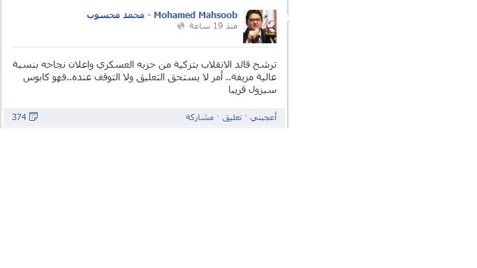 وقال محسوب عبر صفحته الرسمية على موقع التواصل الاجتماعي فيس بوك : "ترشح قائد الانقلاب بتزكية من حزبه العسكري، وإعلان نجاحه بنسبة عالية مزيفة.. أمر لا يستحق التعليق ولا التوقف عنده..فهو كابوس سيزول قريبا".