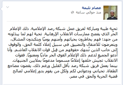 وقال تليمة عبر صفحته الرسمية على موقع التواصل الاجتماعي فيس بوك: "ذلك الإعلام الحُر الذي يفضح ممارسات الانقلاب الإرهابية. تحية لهم لما يبذلونه من جهد؛ فهم يخاطرون بحياتهم وأمنهم يوميًا ويتكبدون المشاق، ويتعرضون للاعتقال والتضييق في سبيل إعلاء كلمة الحق، والوقوف إلى جانب الذين تُنتهك حقوقهم من قِبل قوات الانقلاب الغاشم"