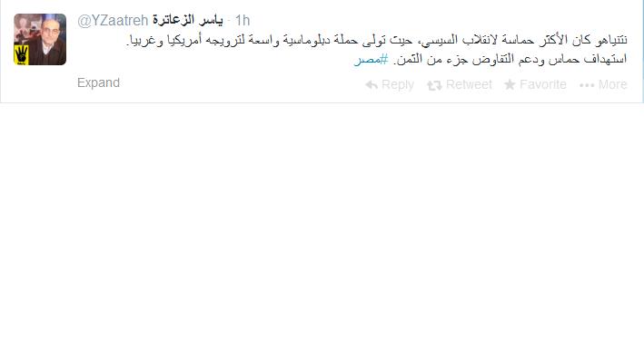 وأضاف الزعاترة عبر حسابه الشخصى على موقع التواصل الاجتماعي "تويتر" – :"نتنياهو كان الأكثر حماسة لانقلاب السيسي، حيث تولى حملة دبلوماسية واسعة لترويجه أمريكيا وغربيا. استهداف حماس ودعم التفاوض جزء من الثمن".