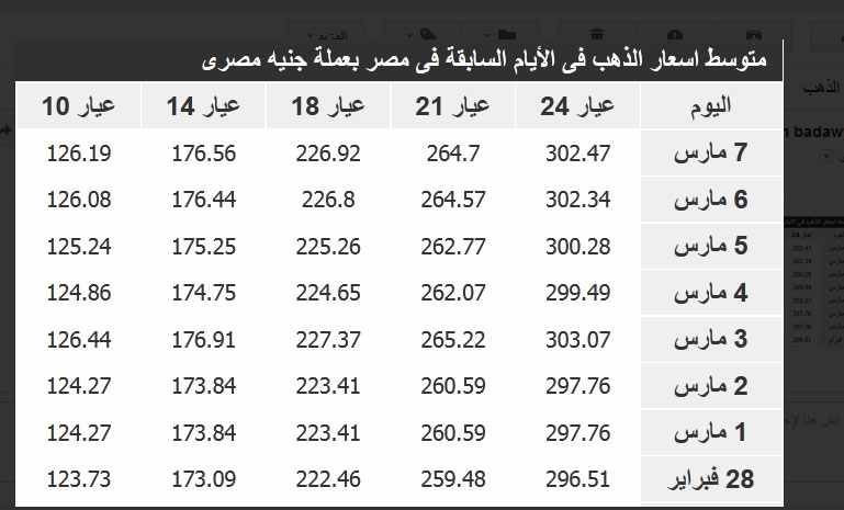 والجدول التالي يوضح أسعار عيارات الذهب خلال الأسبوع الماضي.