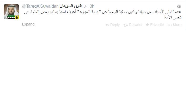 وقال عبر حسابه الشخصي على موقع التواصل الاجتماعي "تويتر": "عندما تغلي الأحداث من حولنا، وتكون خطبة الجمعة عن "نعمة السيارة" أعرف لماذا يساهم بعض العلماء في تخدير الأمة".