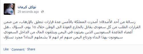 قالت الناشطة اليمنية توكل كرمان في تدوينة لها على صفحتها الشخصية على موقع التواصل الإجتماعي فيس بوك بأن جاءتها رسالة من أحد الأصدقاء تفيد بأنه أصدرت المملكة بالأمس عدة قرارات تتعلق بالإرهاب، من ضمن القرارات الطلب من كل سعودي يقاتل بالخارج العودة الى الوطن خلال ١٥ يوم .