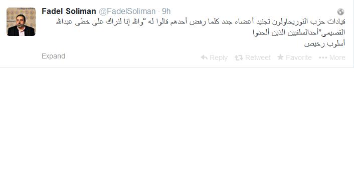 وقال عبر حسابه الرسمي على موقع التواصل الاجتماعي "تويتر" :"قيادات حزب النور يحاولون تجنيد أعضاء جدد كلما رفض أحدهم قالوا له “والله إنا لنراك على خطى عبد الله القصيمي”أحدالسلفيين الذين ألحدوا أسلوب رخيص".
