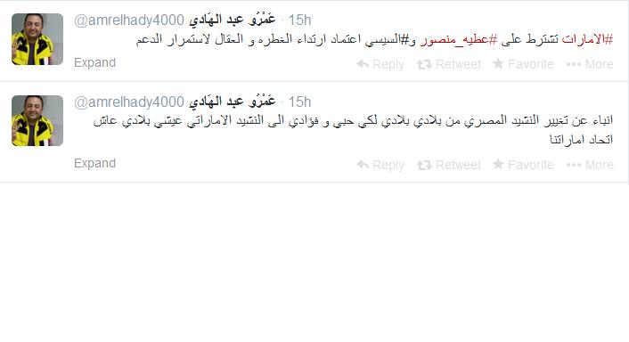 وقال عبر حسابه الرسمي على موقع التواصل الإجتماعي " تويتر" : "الإمارات ترتع في مصر بلد أصغر من شبرا تشتري، وتدير مصر برعاية عبد الفتاح السيسي".