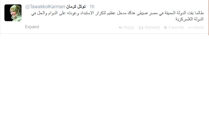 وقالت كرمان عبر حسابها الرسمى على موقع التواصل الاجتماعى "تويتر" :"طالما بقت الدولة العميقة في مصر فسيبقى هناك مدخل عظيم لتكرار الاستبداد وعودته على الدوام والحل في الدولة اللامركزية".