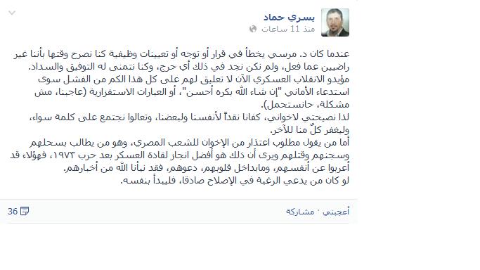 وقال عبر حسابه الرسمي على موقع التواصل الاجتماعي "فيس بوك" : "عندما كان د. مرسي يخطأ في قرار أو توجه أو تعيينات وظيفية كنا نصرح وقتها بأننا غير راضيين عما فعل، ولم نكن نجد في ذلك أي حرج، وكنا نتمنى له التوفيق والسداد".
