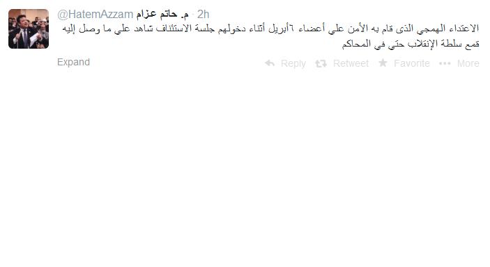 وقال عزام عبر حسابه الشخصى على موقع التواصل الاجتماعى "تويتر" :" الاعتداء الهمجي الذى قام به الأمن علي أعضاء ٦ أبريل أثناء دخولهم جلسة الاستئناف شاهد علي ما وصل إليه قمع سلطة الإنقلاب حتي في المحاكم".