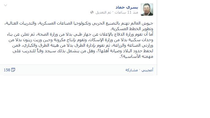وقال عبر حسابه الشخصى على موقع التواصل الاجتماعى "فيس بوك" : " جيوش العالم تهتم بالتصنيع الحربي وتكنولوجيا الصناعات العسكرية، والتدريبات القتالية، وتطوير الخطط العسكرية ، أما أن تقوم وزارة الدفاع بالإعلان عن جهاز طبي بدلا من وزارة الصحة، ثم تعلن عن بناء وحدات سكنية بدلا من وزارة الإسكان، وتقوم بإنتاج مكرونة وجبن وزيت زيتون بدلا من وزارتي الصناعة والزراعة، ثم تقوم بإدارة الطرق بدلا من هيئة الطرق والكباري، فمن لحفظ حدود البلاد وصيانة أهلها؟، وهل من ينشغل بذلك سيجد وقتاً للتدريب على مهمته الأساسية؟".