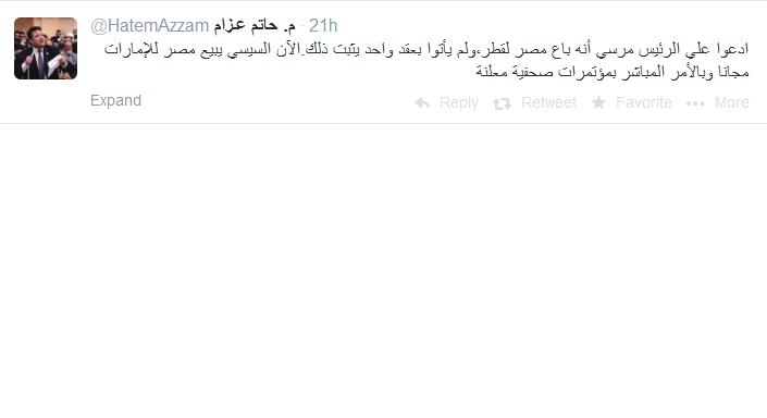 وقال عبر حسابه الرسمي على موقع التواصل الاجتماعى "تويتر" :"ادعوا على الرئيس مرسي أنه باع مصر لقطر، ولم يأتوا بعقد واحد يثبت ذلك. الآن السيسي يبيع مصر للإمارات مجانا، وبالأمر المباشر في مؤتمرات صحفية معلنة".