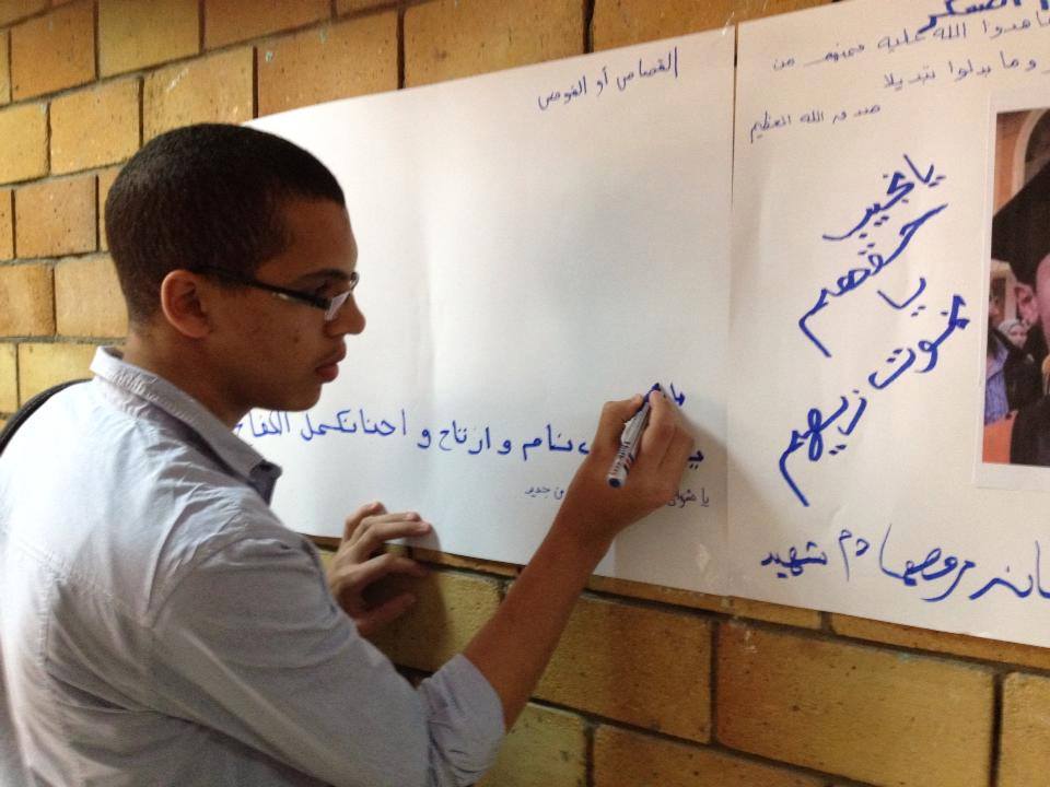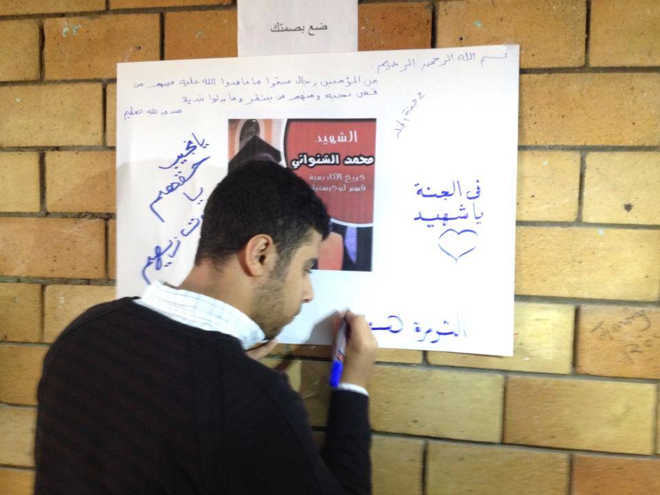 وقاموا بتوزيع منشورات بالسيرة الذاتية للشهيد وملصقات بالمدرجات وفصول الدراسة , وقاموا بعمل لوحه ليتم توثيق رسائل للشهيد مقدمه من زملائه الطلاب .