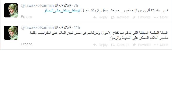 وقالت عبر حسابها الرسمي على موقع التواصل الاجتماعي "تويتر": أن "الحالة السلمية المطلقة التي يتمتع بها كفاح الإخوان وشركائهم في مصر تجبر العالم على احترامهم، مثلما ستجبر انقلاب العسكر على السقوط والرحيل".