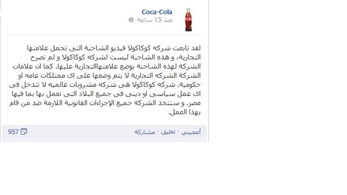 وأضافت: "شركة كوكاكولا هي شركة مشروبات عالمية لا تتدخل في أي عمل سياسي أو ديني في جميع البلاد التي تعمل بها بما فيها مصر. وستتخذ الشركة جميع الإجراءات القانونية اللازمة ضد من قام بهذا العمل".