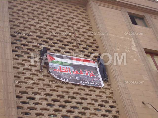 حيث قام الطلاب خلال المسيرة  برفع علم فلسطين ، وتعليق بنر على واجهة كلية التجارة يحمل فى عنوانه الرئيسى " غزة فى القلب " للتأكيد على موقف الطلاب من رغبتهم فى مساندة آشقائهم فى فلسطين المحتلة ، وتضامنا مع  ما يلاقونه من معاناة على إثر الحصار المفروض عليهم من قبل قوات الإحتلال الصهيوني  .