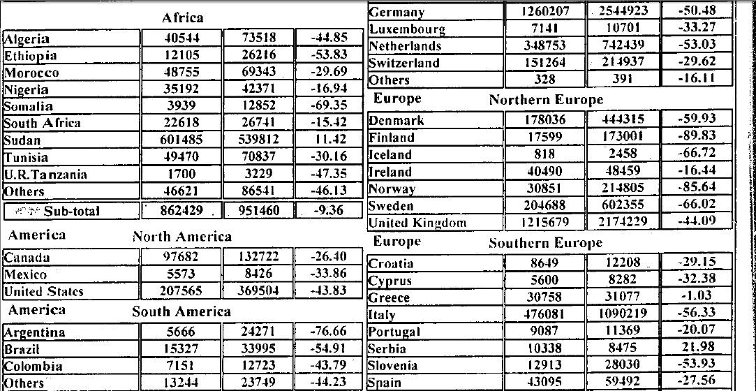 ووفقًا للقائمة، جاءت فنلندا بمقدمة الدول التي تراجعت أعداد السائحين الوافدين منها بنسبة 89% حيث وفد منها 17.5 ألف سائح مقابل 173 ألفًا في الشهر ذاته من العام السابق.