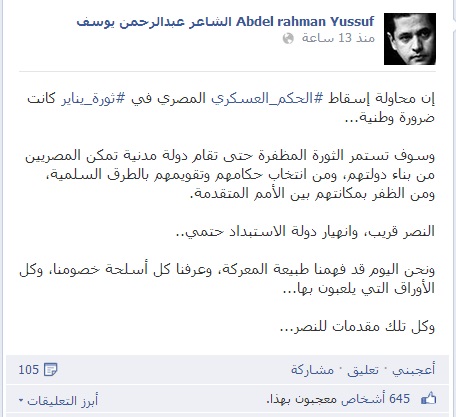 وقال يوسف عبر صفحته الشخصية على موقع التواصل الاجتماعي"فيس بوك" :" إن محاولة إسقاط الحكم العسكري المصري في ثورة يناير كانت ضرورة وطنية…".