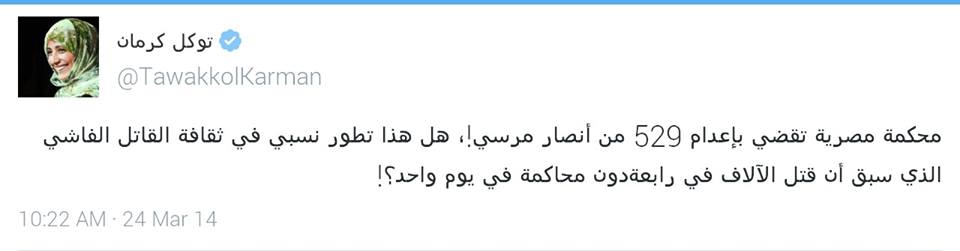 وأضافت كرمان على صفحتها الرسمية على موقع التواصل الاجتماعى" توتير" "هل هذا تطور نسبي في ثقافة القاتل الفاشي الذي سبق أن قتل الآلاف في رابعة دون محاكمة في يوم واحد".