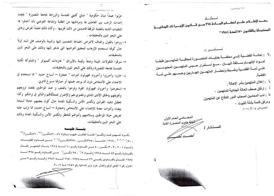 أمرت النيابة العامة بإحالة قضية طلاب هندسة المنصورة لمحكمة جنايات المنصورة مع استمرار حبس الطلاب المعتقلين, و ضبط وإحضار الطلاب المتغيبين وحبسهم على ذمة القضية.