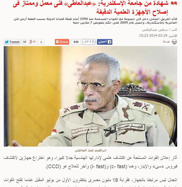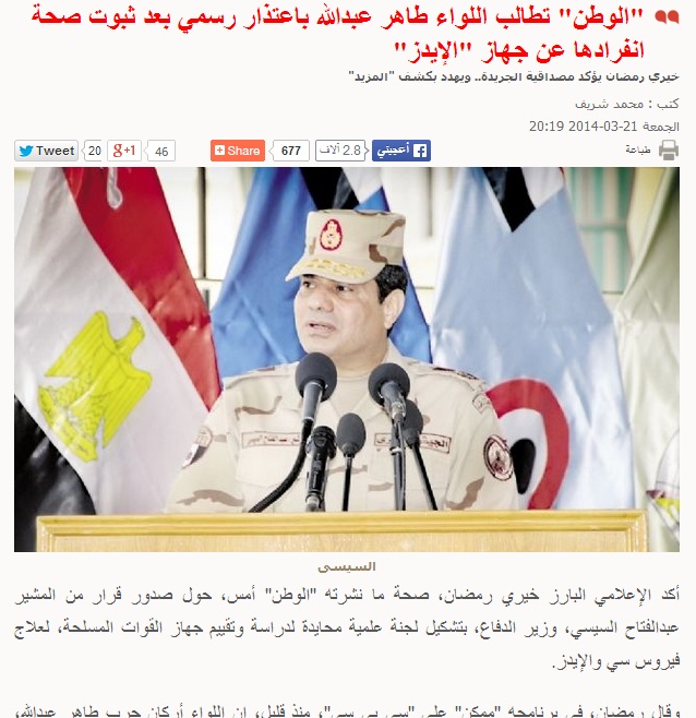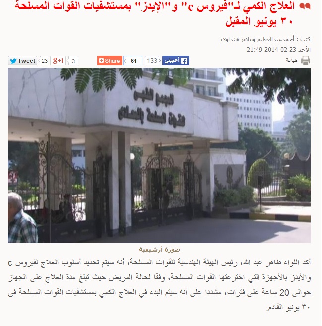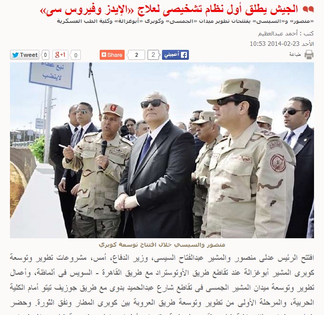 فى يوم الأحد 23 فبراير 2014 طالعتنا جريدة الوطن بعنوان كبير "الجيش يطلق أول نظام تشخيصى لعلاج «الإيدز وفيروس سى".