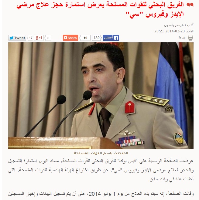 وفى يوم 23 مارس 2014 نشرت جريدة الوطن تصريحا على لسان المتحدث باسم الجيش تحت عنوان "الفريق البحثي للقوات المسلحة يعرض استمارة حجز علاج مرضي الإيدز وفيروس "سي".