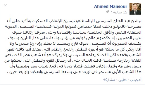 وقال منصور عبر صفحته الرسمية على موقع التواصل الاجتماعي "فيس بوك" :" ترشح عبد الفتاح السيسى للرئاسة هو ترسيخ للانقلاب العسكرى وتأكيد على أن مسرحية 30يونيو دخلت فصلا جديدا من فصولها الهزلية .