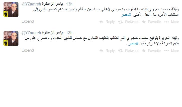 وأضاف الزعاترة عبر حسابه الشخصى على موقع التواصل الاجتماعي "تويتر" :" وثيقة الجزيرة بتوقيع محمود حجازي التي تطالب بتكثيف التعاون مع حماس لتأمين الحدود رد صارخ على من يتهم الحركة بالإضرار بأمن مصر".