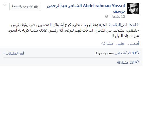وأضاف يوسف عبر صفحته الشخصية على موقع التواصل الاجتماعي "فيس بوك" :" انتخابات الرئاسة المزعومة لن تستطيع كبح أشواق المصريين في رؤية رئيس حقيقي، منتخب من الناس، لم يأت لهم ليزعم أنه رئيس عادل بينما كرباجه أسود من سواد الليل !!"