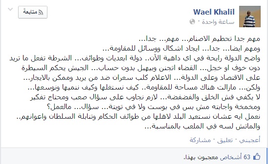 وأشار خليل إلى أنه "لا يكفي فش الخلق والفضفضة ، لازم نجاوب على سؤال صعب ومحتاج تفكير ومخمخة وإجابته مش بس في بوست ولا في تويتة ، سؤال.. مالعمل؟".