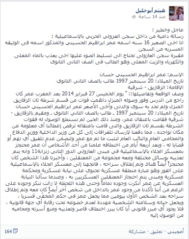 وكانت تفاصيلها كالتالى :" يوم الخميس 27 فبراير 2014 بعد المغرب عمر كان راجع من الدرس وفور وصوله المنزل داهمت قوات من قسم شرطة ثان الزقازيق المنزل ولم تجد به سوى والدتى وأخى الأصغر عمر ابراهيم الحسيني حسان تاريخ الميلاد: 20 سبتمبر 1997 ـ طالب بالصف الثاني الثانوي ـ ومقيم بالزقازيق – شرقية فقامت باعتقال عمر، ومنذ ذلك الحين لم نستطع الوصول له فقوات الشرطة بقسم ثان الزقازيق والتى قامت باعتقاله ترفض إعطائنا أى معلومة عن مكان تواجده ، مما دفعنا لإرسال تلغرافات إلى كل من وزير الداخلية ووزير الدفاع والمحامي العام والنائب العام لنثبت ما تم مع عمر ولنضمن عدم تلفيق أي تهم أو قضايا له ، وبعد أربعة أيام من اختطافه علمنا من أحد الأشخاص أن عمر محتجز بمعسكر الجلاء بالإسماعيلية في مبنى العازولي الدور الثاني زنزانة11 وانه يتم تعذيبه بوسائل مختلفة ومعه مجموعة من المعتقلين ، وأخبرنا هذا الشخص كان محتجزاً أيضاً هناك وتم إطلاق سراحه ، فاتجهنا إلى معسكر الجلاء بالإسماعيلية على الفور وهو عبارة منطقة عسكرية تحتوي على نيابة عسكرية ومحكمة عسكرية ومبنى يتم احتجاز المعتقلين العسكريين به ، وعندما سألنا النيابة العسكرية عن عمر أنكرت وجوده تماماً وحتى هذه اللحظة لا زالت تنكر وجوده على الرغم من أننا تأكدنا من وجود عمر بالداخل من شخص آخر أيضاً كان معه وتم إطلاق سراحه بعد الشخص الأول بيومين مما يجعل عمر في حكم المُخفَى قسريا ، ويجعل حياته وسلامته الشخصية مهددة لعدم خضوعه تحت رقابة أي جهة قانونية ، فلا يجود أي مبرر قانوني أيا كان يبرر اختطاف قاصر وتعذيبه ومنع أسرته ومحاميه من الوصول إليه".
